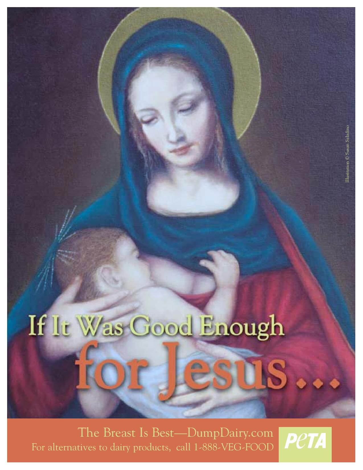 In the wake of an incident in which police were called on two mothers breastfeeding their babies at the Mora Aquatic Center, PETA is moving to place its pro-breastfeeding billboard near the pool in support of all nursing mothers. The ad shows an image of Mary breastfeeding the baby Jesus alongside the words “If It Was Good Enough for Jesus … The Breast Is Best. Dump Dairy.“