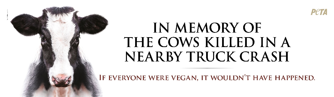 In remembrance of the nearly two dozen cows who died after the truck carrying them rolled over on a freeway ramp from Interstate 15 to Interstate 11 in downtown Las Vegas on Wednesday morning, PETA plans to place a memorial billboard near the accident site that proclaims, in part, “If Everyone Were Vegan, It Wouldn’t Have Happened.”