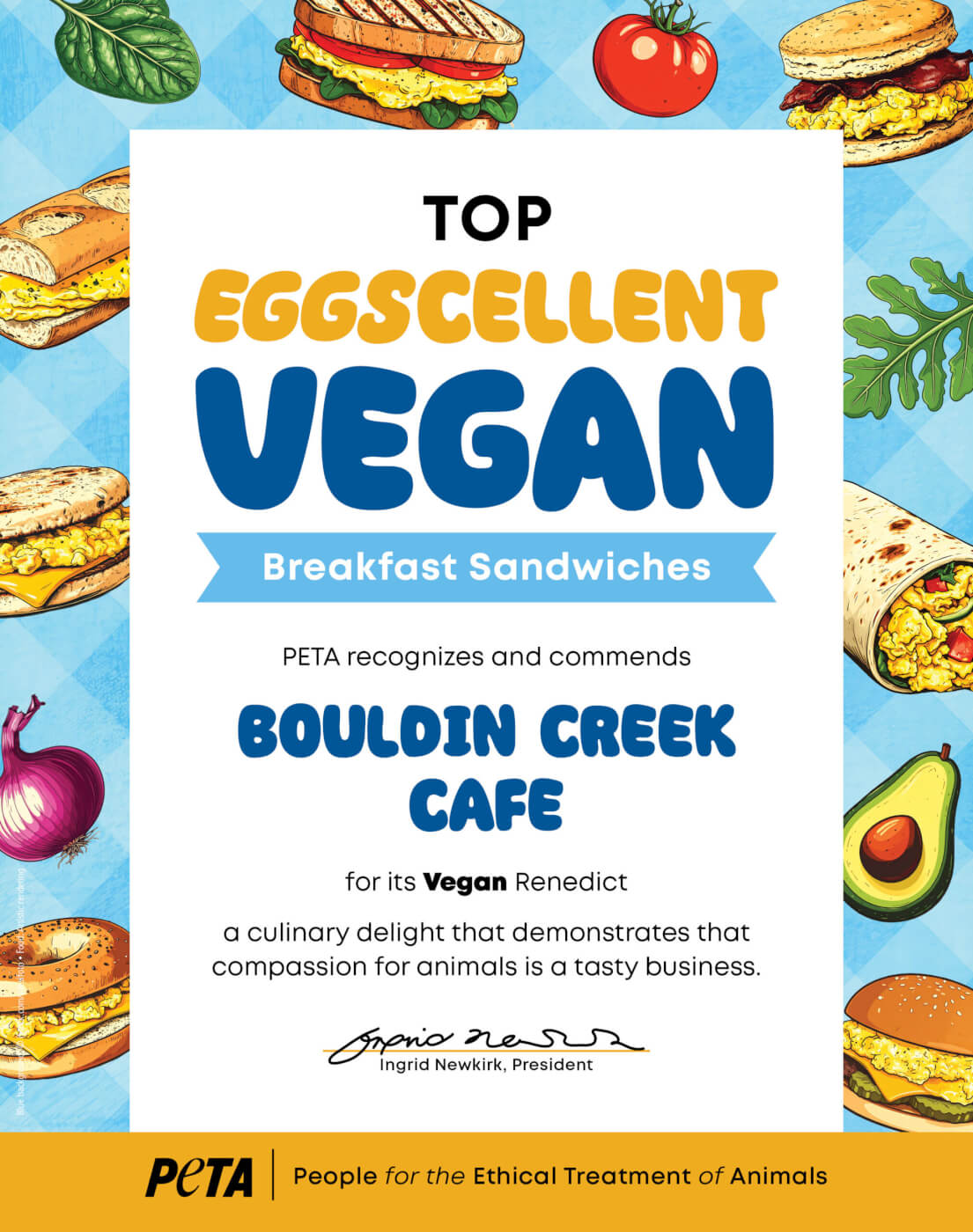 Scrambling for the win! Following a massive spike in bird flu cases, which brought egg prices to an all-time high, and with the next zoonotic disease outbreak potentially right around the corner, PETA is announcing its picks for the nation’s Top Eggsellent Vegan Breakfast Sandwiches—and Austin’s own Bouldin Creek Cafe has made the list. The eatery, which celebrated its 25th anniversary last month, serves up the mouthwatering Renedict, featuring tofu bacon, organic baby spinach, sliced tomatoes, and tofu scramble on an open-faced grilled ciabatta with vegan hollandaise sauce and scallions.