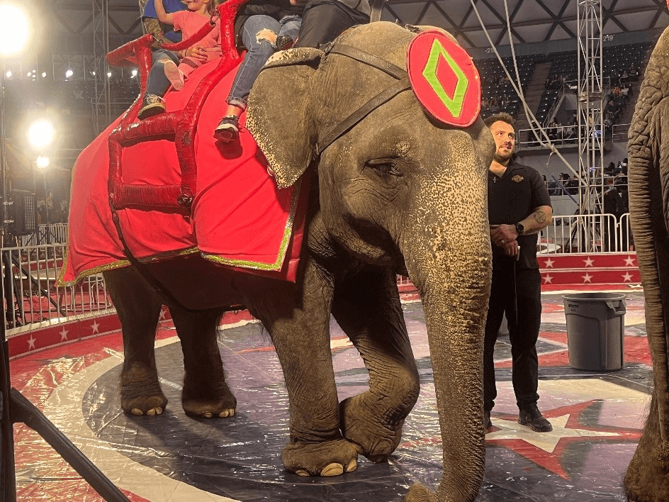 Betty the elephant at a circus performance in Belton, Texas. The handler can be seen holding a bullhook. Photo: PETA