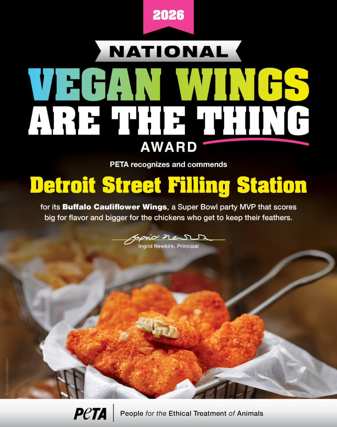“Detroit Street Filling Station is dishing up touchdown-worthy gameday nosh with its delicious buffalo cauliflower wings, which are as finger-licking good as they are kind to chickens,” says PETA President Tracy Reiman. “Every winner on PETA’s list shows that doing right by animals and your arteries ain’t no thing but a vegan wing.”