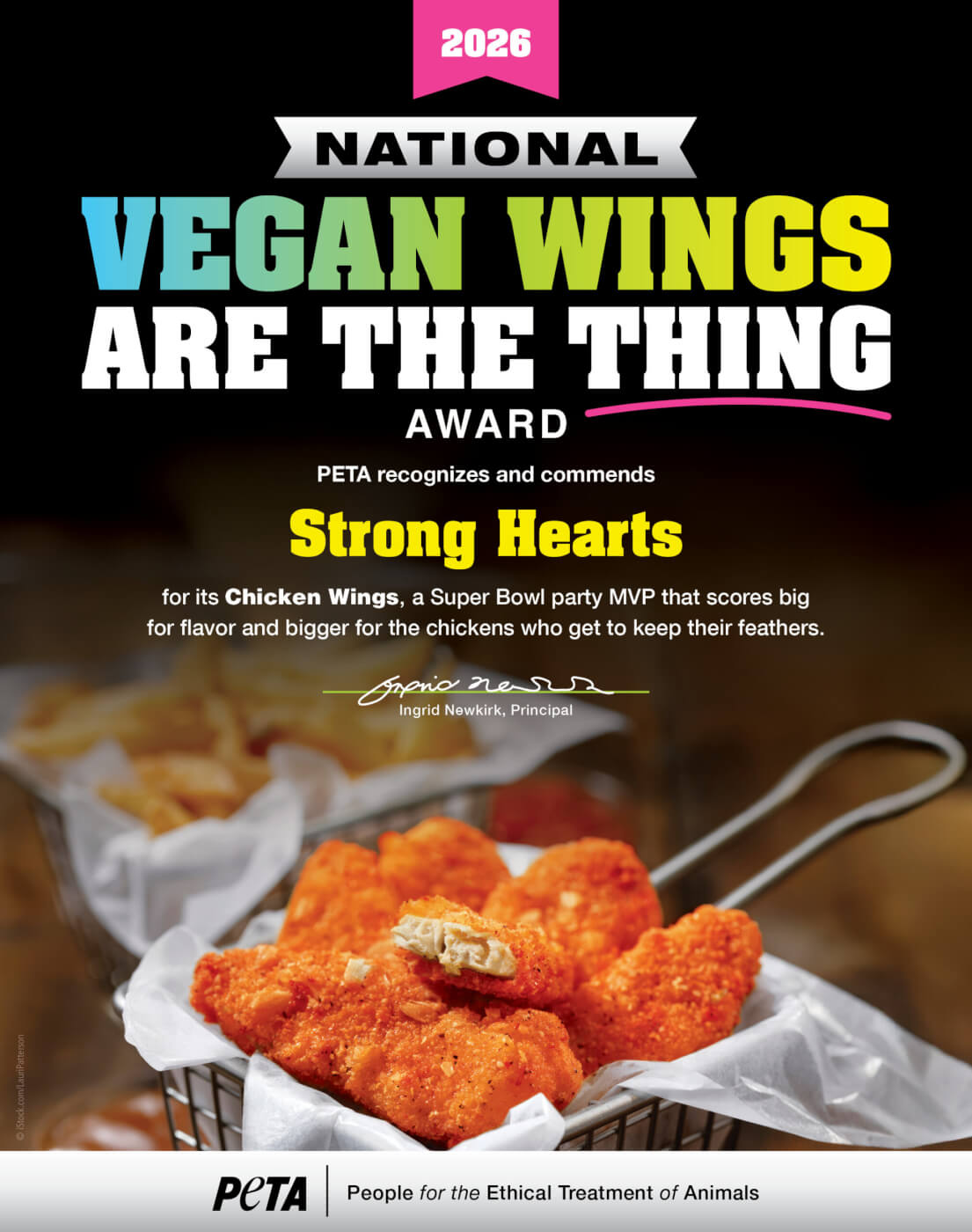 “Strong Hearts is dishing upgame-changing gameday nosh with its delicious vegan wings, which are as finger-licking good as they are kind to chickens,” says PETA President Tracy Reiman. “Every winner on PETA’s list shows that doing right by animals and your arteries ain’t no thing but a vegan wing.”