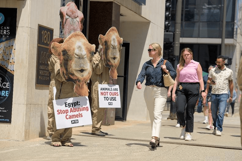 On Monday, PETA supporters wearing oversized camel masks will descend on the Egyptian Embassy to protest the Egyptian government’s failure to abate beatings, malnourishment, and deaths of camels and horses forced to haul tourists around the Great Pyramids. This follows the release of a new PETA exposé showing dead horses piled up in a secret graveyard, and severely emaciated camels and horses being struck repeatedly and suffering from untreated wounds.