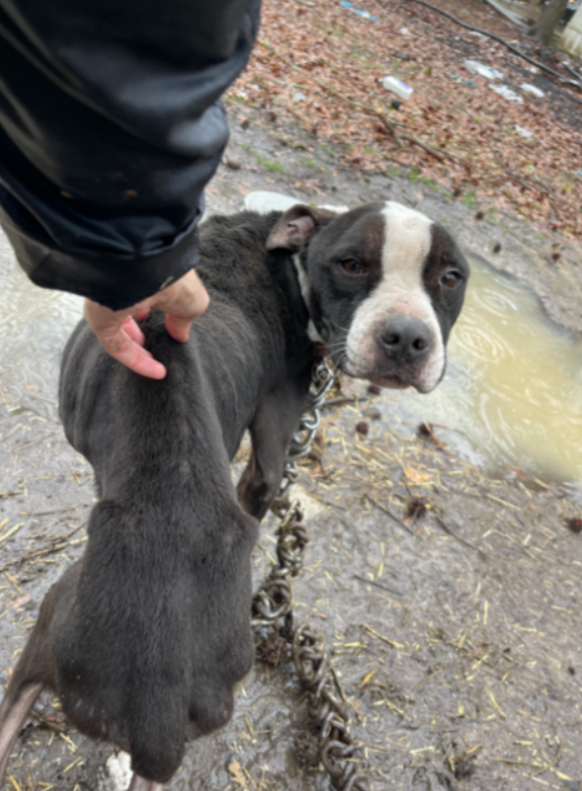 On February 26, during a routine check, PETA fieldworkers found Cash with his spine, ribs, and hipbones jutting out. He was being kept tethered outside—which is illegal in Halifax County—by a short and extremely heavy metal chain attached to a tree. The chain was so tangled that Cash could barely access his plastic doghouse, his only protection from the elements. The area around Cash’s doghouse was mostly flooded, leaving him with no escape from the cold and pouring rain. After convincing Bowser to hand over custody of Cash, fieldworkers rushed Cash to an emergency veterinary clinic, where he was found to be “chronically starved” and suffering from a heavy parasite infestation, heartworm disease, anemia, and ehrlichiosis, a tick-borne disease.