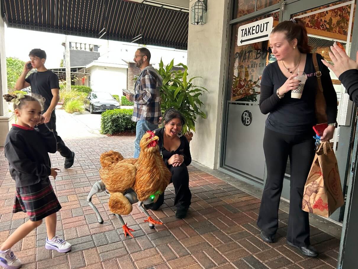 Football fans flocking to town for the Big Game may come face-to-beak with the giant, walking, talking, AI-powered robo-chicken, “Hennifer Coolidge,” who will cluck her way through San Jose, San Francisco, and Santa Clara this week, urging everyone to spare her feathered friends and pick up some fabulous vegan options instead. Named in honor of the vegan award-winning actress Jennifer Coolidge—and voiced to sound just like her—PETA’s chatty chicken will spout sassy phrases, including “I want you to go vegan real bad,” as she greets fans outside the San Jose McEnery Convention Center on Monday for Super Bowl Opening Night and outside Levi’s Stadium on Super Bowl Sunday.