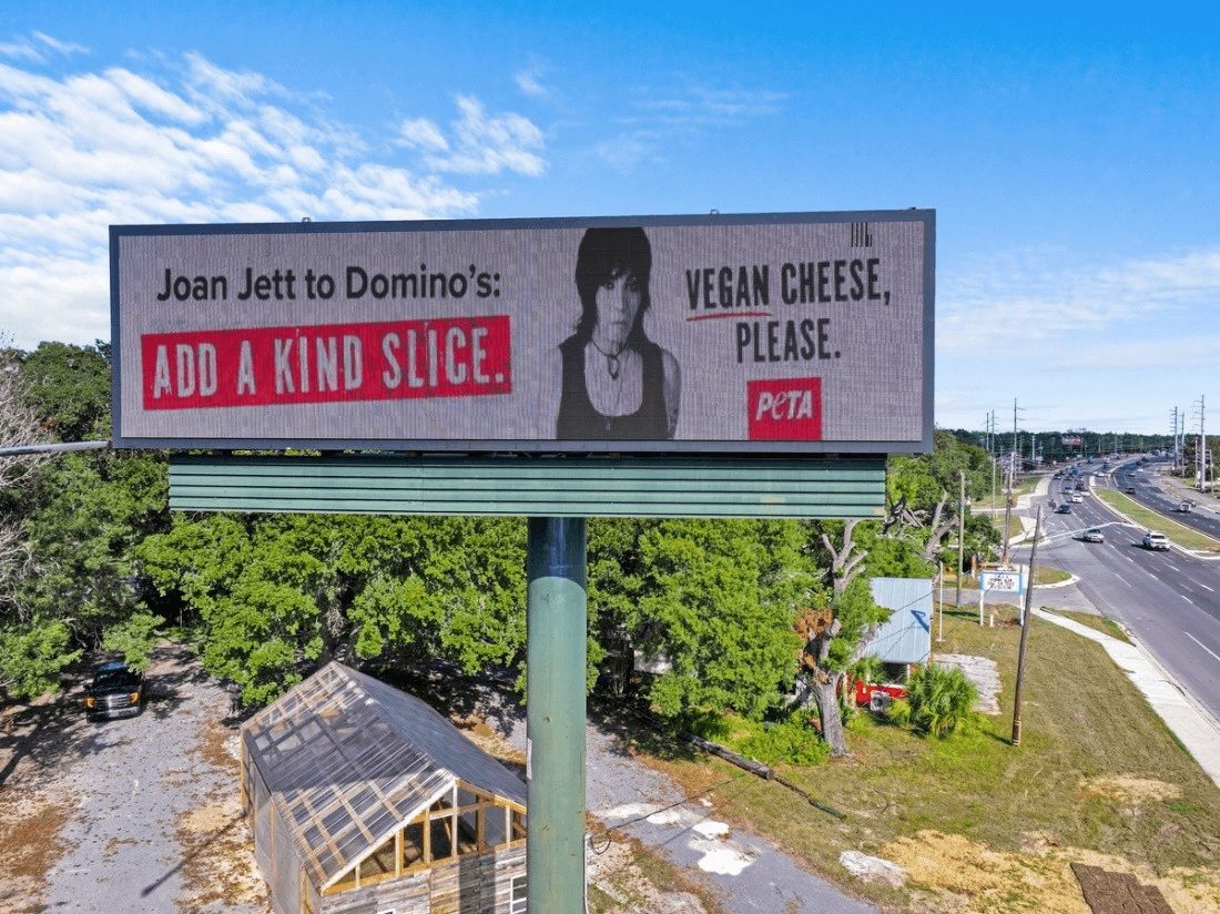 Music icon Joan Jett loves rock ‘n’ roll … and vegan pizza. In a new appeal that just went up outside Domino’s on Gulf Breeze Parkway, the rock legend is cranking up the pressure on the pizza chain to add vegan cheese to its pies and avoid a bad reputation among customers who can’t stomach dairy cheese for ethical, religious, environmental, or dietary reasons. Jett’s message is part of PETA’s new nationwide campaign urging Domino’s to add vegan cheese to its U.S. menus—as the company has already done in the U.K., Australia, Germany, Spain, and more.
