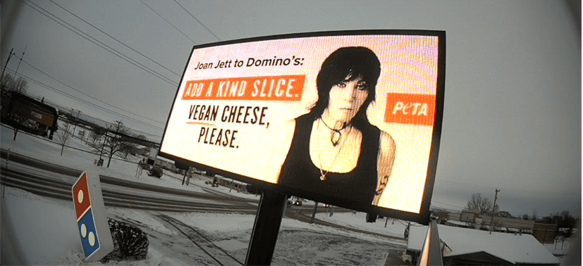 Music icon Joan Jett loves rock ‘n’ roll… and vegan pizza. In a new sky-high appeal that just went up outside Domino’s on Wright Ave, the rock legend is cranking up the pressure on the pizza chain to add vegan cheese to its pies and avoid a bad reputation among customers who can’t stomach dairy cheese for ethical, religious, environmental, or dietary reasons. Jett’s message is part of PETA’s new nationwide campaign urging Domino’s to add vegan cheese to its U.S. menus—as the company has already done in the U.K., Australia, Germany, Spain, and more.