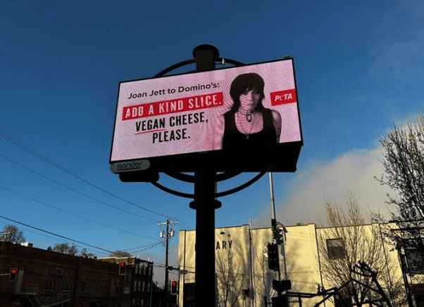Music icon Joan Jett loves rock ‘n’ roll … and vegan pizza. In a new appeal that just went up outside Domino’s on Main Street, the rock legend is cranking up the pressure on the pizza chain to add vegan cheese to its pies and avoid a bad reputation among customers who can’t stomach dairy cheese for ethical, religious, environmental, or dietary reasons. Jett’s message is part of PETA’s new nationwide campaign urging Domino’s to add vegan cheese to its U.S. menus—as the company has already done in the U.K., Australia, Germany, Spain, and more.