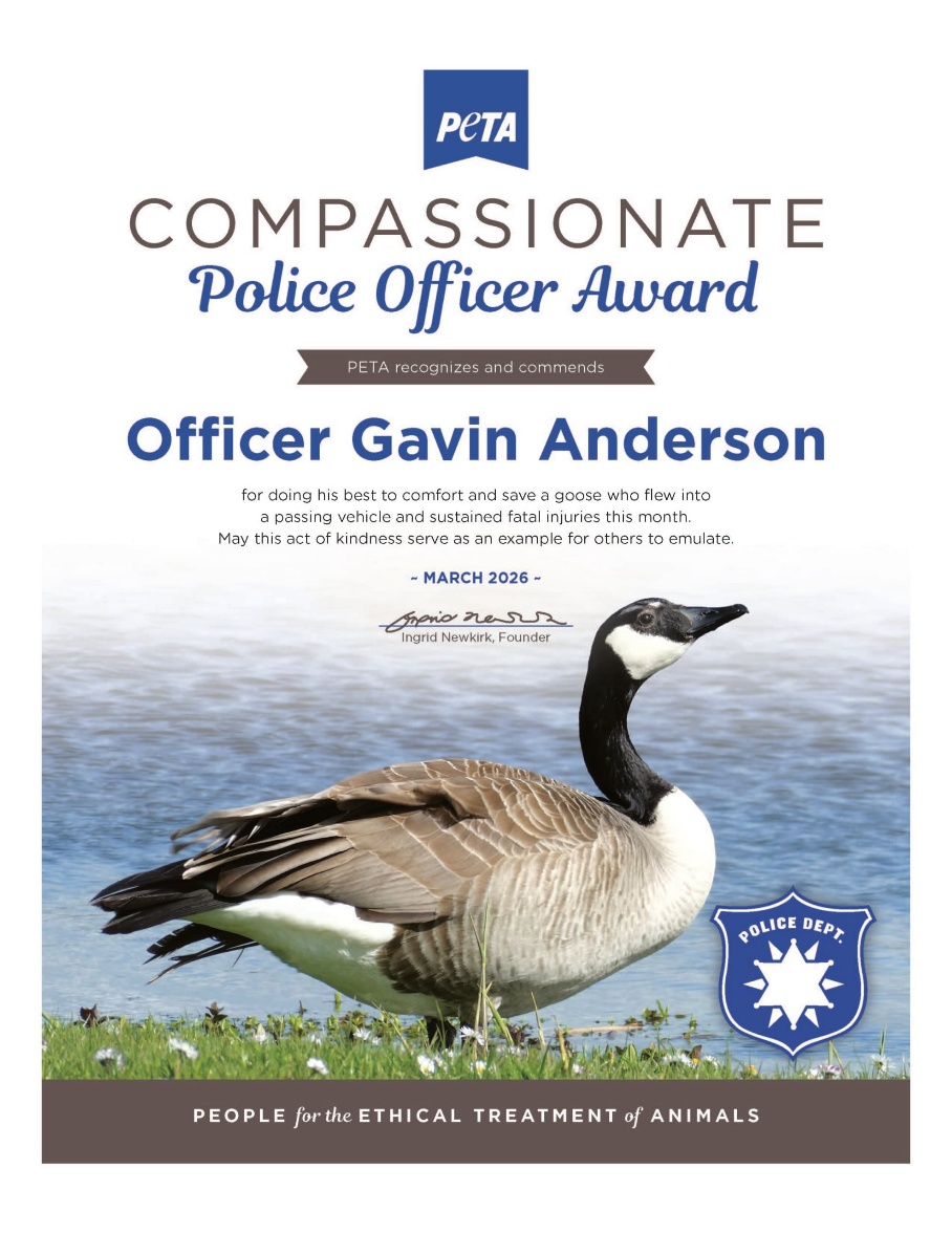 A Compassionate Police Officer Award is on its way from PETA to the Middletown Police Department in recognition of Officer Gavin Anderson’s kindness and determination in racing to help a goose who was left injured on the side of the road after being hit by a car.