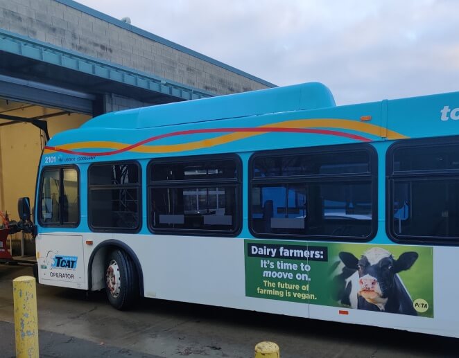 New year, new major at one of the top agricultural science schools in the country? As vegan milk continues to grow in popularity—and dairy milk consumption continues to decline, dropping by almost half since 1975—more than a dozen PETA messages have popped up on bus shelters and buses surrounding Cornell University to remind dairy science students and local farmers that the future of farming is vegan and it’s time to moove on from the cruel dairy industry. PETA points out that vegan milk sales are skyrocketing—with a 19% growth from 2019 to 2022, compared to animal-based milk, which declined by 4% during that same period—and are expected to see a compound annual growth rate of 11.5% through 2030.