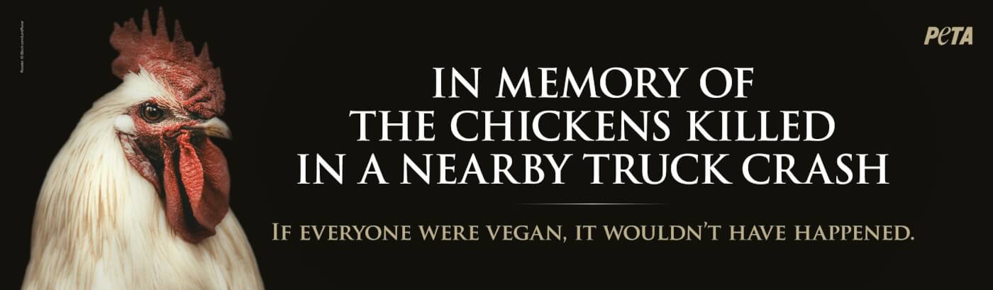 “Countless chickens died in terror and agony in this crash, while the traumatized survivors were trucked to the slaughterhouse to have their throats slit and their bodies carved up,” says PETA President Tracy Reiman. “PETA urges everyone to please, go vegan, to help prevent animals from suffering on trucks and in slaughterhouses in the first place.”