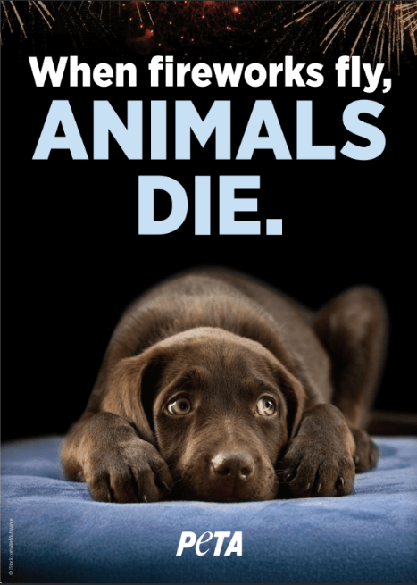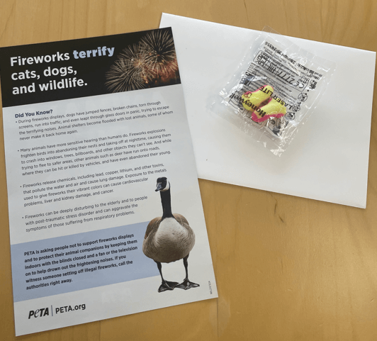 In an enclosed letter, PETA points out that more companion animals go missing on Independence Day than on any other day of the year. Shelters across the country take in 30% to 60% more animals between July 3 and 6, many of whom arrive with bloody paws or broken bones. Other animals don’t even make it to shelters—they’re hit by cars or strangled when their collars become caught on fences.