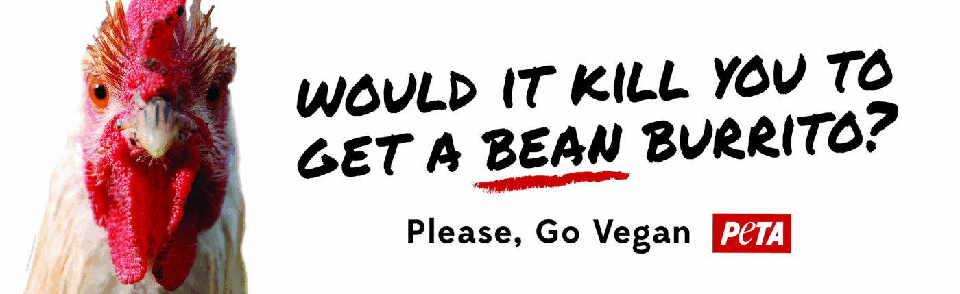 “We want ‘chicken out’ to mean skip the burrito that represents the suffering of a living individual who felt pain and fear and didn’t want to be killed,” says PETA Founder Ingrid Newkirk. “PETA’s billboard encourages people to consider who is in that burrito and let chickens and other animals Live Más by ordering up the beans or potatoes.”