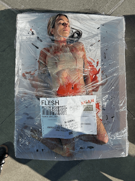 On Tuesday, a trio of nearly nude PETA supporters covered in “blood” and lying on giant meat trays wrapped in cellophane—complete with spoof “humane” labels—will take aim at the bogus certification scheme used to market the flesh of animals and dupe kind consumers into paying more for the same old cruelty.