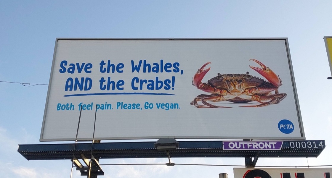 The National Oceanic and Atmospheric Administration recently announced a spike in whales getting entangled in fishing gear, and at least nine humpback whales have reportedly been caught in crab fishing and other gear off the coast of California since September 2024. In response, PETA has erected a sky-high appeal near Seaside Seafood & Market and other Monterey restaurants that serve crabs and other sea animals, and just a mile from top commercial fishing harbor Moss Landing. The pointed plea reminds everyone that crabs may be small, but Biology 101 tells us that they experience pain, and common sense tells us they value their lives as much as whales do, and that anyone disturbed by the idea of killing whales should save them both by going vegan.