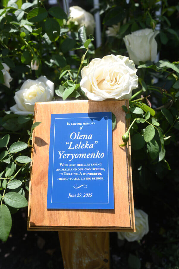 This afternoon, PETA held a memorial service and dedicated a white rose bush and memorial plaque in its Bea Arthur Dog Park on Front Street in honor of Dr. Olena “Leleka” Yeryomenko, a Ukrainian combat medic and war hero who was killed on June 29 while going to the aid of a wounded soldier, shortly after helping evacuate 42 dogs under intense Russian shelling. Photos from the dedication are available here. A video about Leleka and showing her work rescuing animals is here.