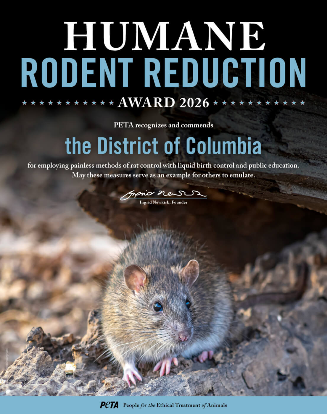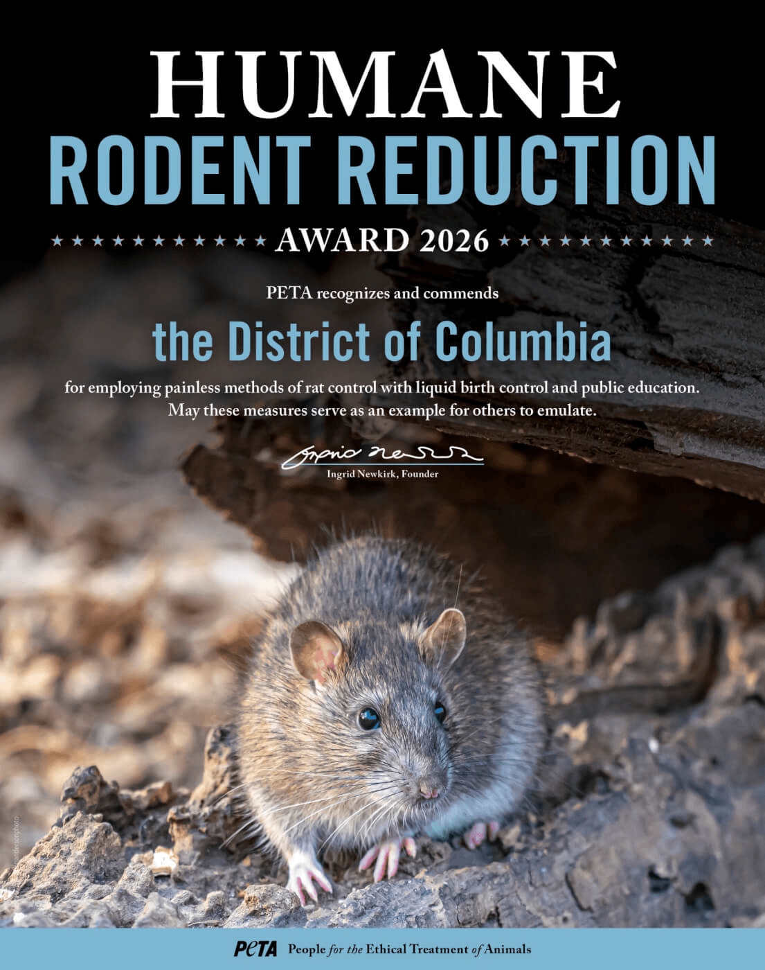 I hope you are well. I’m writing on behalf of People for the Ethical Treatment of Animals—PETA entities have more than 10.4 million members and supporters globally, including many in Washington, D.C., where we have an office near the White House—in response to reports that city officials will employ edible rat birth control liquid and remind residents about the importance of trash mitigation to control rat population growth. When I was Chief of Zoonotic Disease Control for the D.C. DHS, the city used devastating, painful poisons like red squill and made no attempts to educate the public at all. We are therefore delighted to inform you that we are presenting you with a Humane Rodent Reduction Award to honor these measures.