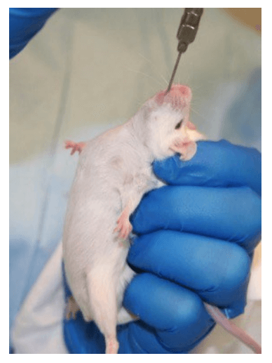 A mouse being force-fed, a typical practice in food industry-supported testing. The cruel procedure damages animals’ throats and produces no relevant information about human health.