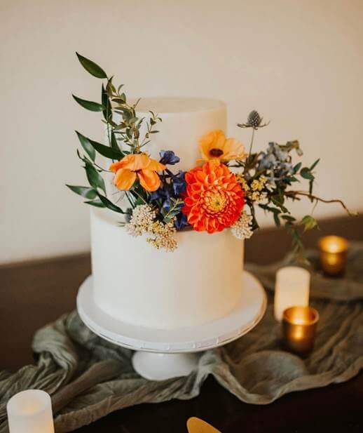 An elegant two-tiered vegan wedding cake with colorful, romantic flowers by Hazel & Jade. Credit: Sarah Zimmerman