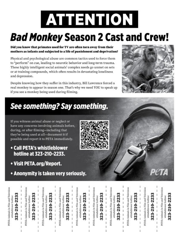 “Bad Monkey, and any production that uses real wild animals, is bad news for these thinking, feeling, complex beings who are treated like mere props and typically forced to perform under the threat of violence,” PETA Director of Animals in Film and Television Lauren Thomasson. “Monkeys can’t speak up for themselves, so PETA urges anyone who witnesses animal abuse or sees anything of concern on set to report it immediately.”