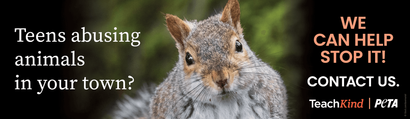 Following the arrest of a Battle Ground High School student, Trevor Ek, who is charged with multiple counts of cruelty to animals for allegedly shooting squirrels with a blow dart gun in Lewisville Regional Park, TeachKind—PETA’s humane education division—is rushing humane education resources to Battle Ground Public Schools Superintendent Shelly Whitten, along with an urgent letter stressing the need for classroom lessons condemning bullying and harming others and fostering empathy for all. PETA is also erecting a sky-high community message asking anyone who suspects any youngster of abusing animals—or who hopes to stop the problem before it starts—to contact TeachKind for free classroom presentations, lessons, and other resources that help parents and educators cultivate compassion.
