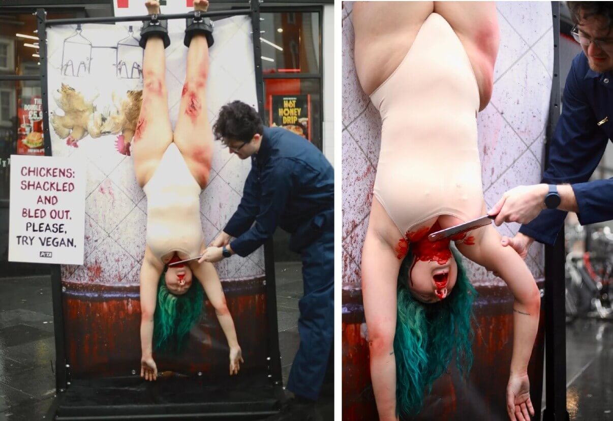 PETA supporters will deliver a shocking message to those attending the grand opening of Raising Cane’s on Tuesday, when a woman will be hung upside down and have her throat “slit” to demonstrate how chickens are killed for those “chicken fingers.” The pro-vegan display is designed to illustrate the point that every chicken raised for their flesh meets a terrifying end, and that human beings and chickens are the same in all the ways that matter, including their experience of pain and fear.