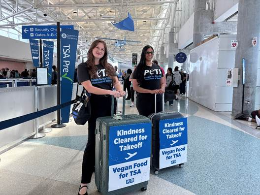 The suitcases—bearing signs reading, “Kindness Cleared for Takeoff. Vegan Food for TSA.”—will contain non-perishable, animal-friendly essentials including shelf-stable vegan milks, vegan jerky, protein bars, dairy-free mac and cheese, and more, as well as food, treats, and toys for companion animals.