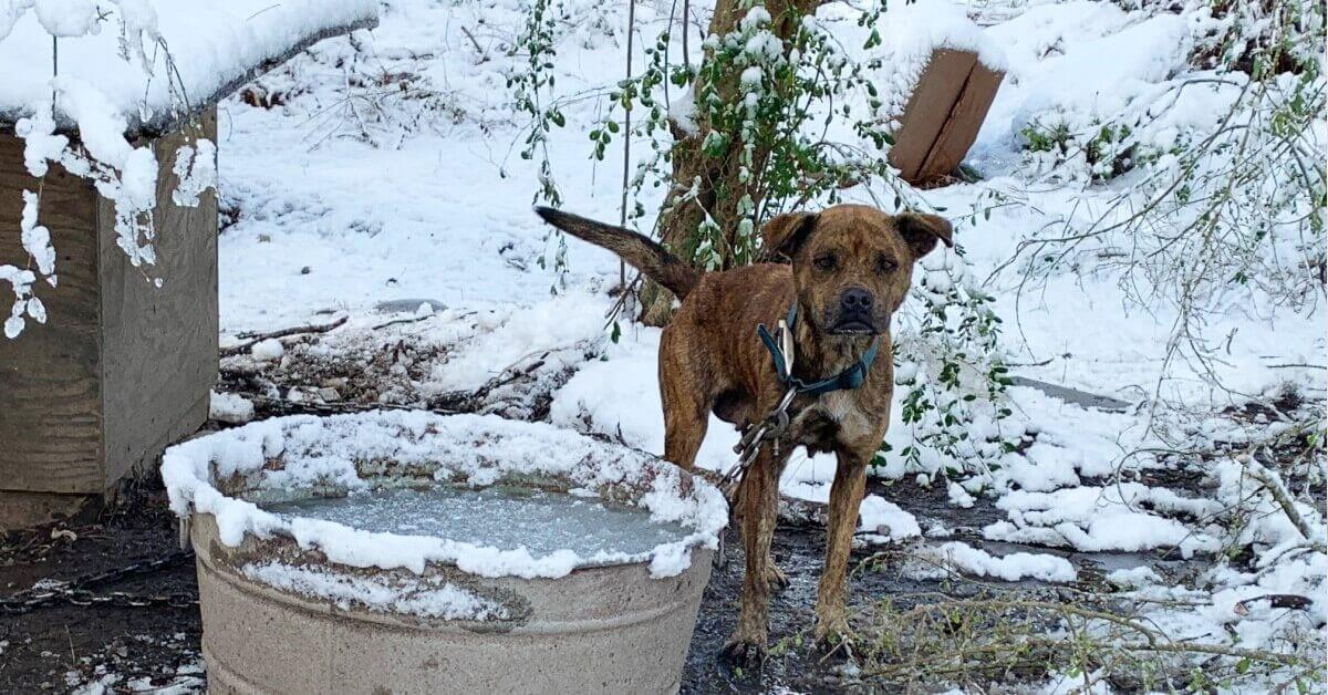 Good Samaritans who see companion animals kept chained or penned outside 24/7 or without adequate shelter from the elements should note the animals’ exact location and alert local law-enforcement authorities immediately. Anyone who leaves animals outside to suffer in severe weather may be prosecuted.