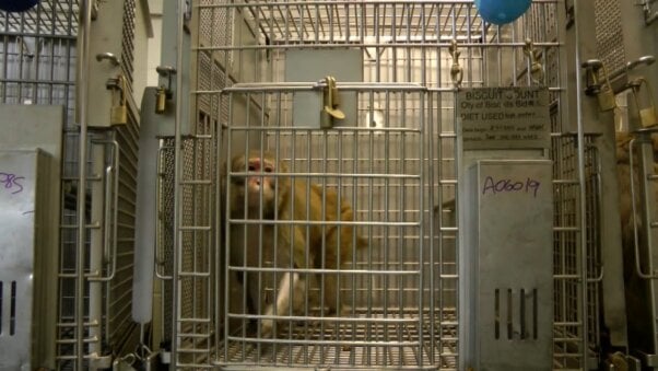 Monkey caged at the Washington National Primate Research Center. Image obtained through a public records request by PETA.