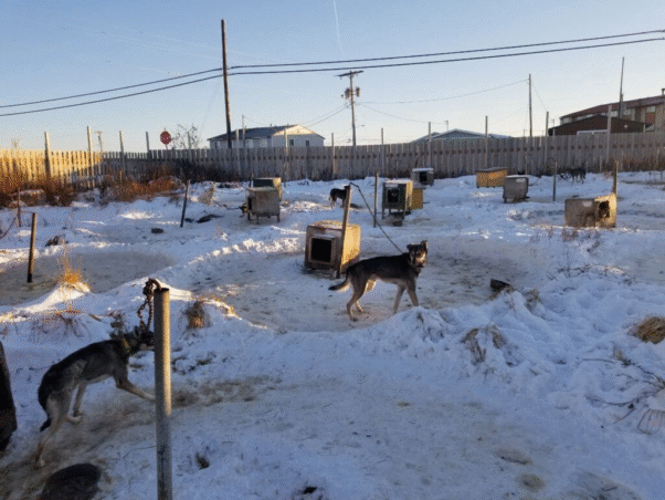 Dogs chained outside at a dog yard in Alaska. Photo: PETA