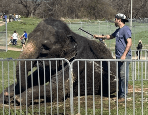 The video also shows a trainer forcefully jabbing another elderly elephant, named Whimpy, directly in the ear, causing her to recoil in pain—a technique taught by notorious trainer Tim Frisco, who can also be seen in the footage working at the circus’s compound, and who was caught on camera during a PETA investigation instructing handlers to beat elephants with bullhooks to “make ‘em scream.” Both Traci and Whimpy are shown swaying back and forth, a known sign of psychological distress—as one observer remarks, they’re “probably being mistreated.”