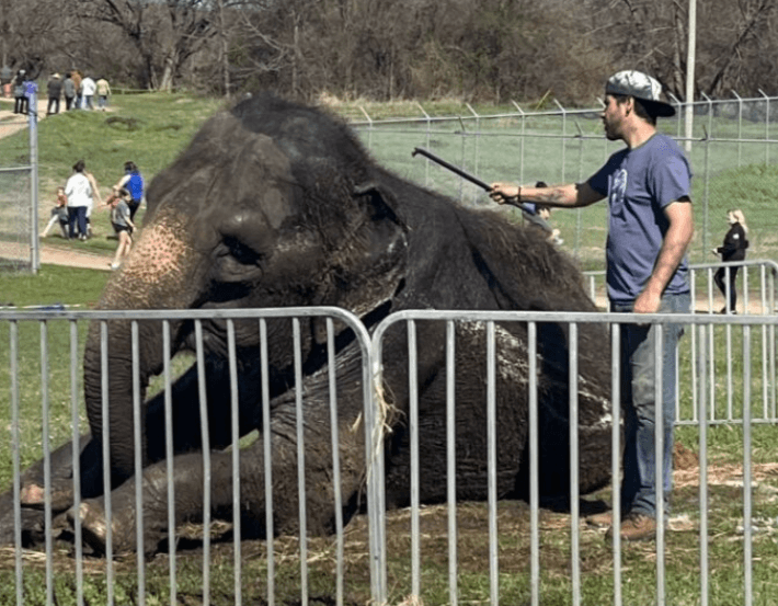 An elderly elephant named Traci, struggling to stand so that she can relieve herself, is repeatedly jabbed with a sharp, steel-tipped weapon called a bullhook as a trainer yells, “Traci, lie down!” The trainer twists and wrenches the bullhook into the most sensitive parts of her body until she collapses back onto the ground, soiled with her own waste. A child watching nearby can be heard saying, “She doesn’t want to do it.” New video footage from PETA reveals that this is what passes for “retirement” at Carson & Barnes Circus’s Hugo-based “Endangered Ark Foundation,” where elderly elephants in their late 50s are jabbed with bullhooks and forced into “encounters” with paying visitors—and PETA is calling for criminal charges to be filed against those responsible for the abuse.