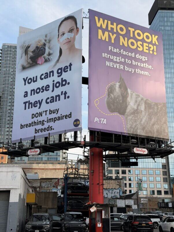 The condemnation comes from on high too, as PETA has placed three giant billboard messages directly across from the Javits Center—where breeders will put their dogs through the canine “beauty pageant”—an exercise that demonstrates the stark difference between the skull and snout of a healthy dog and that of a pug or French bulldog. The boards invite any BIB guardians facing exorbitant veterinary bills as a result of breeding deformity to visit PETA.org/BredToSuffer.