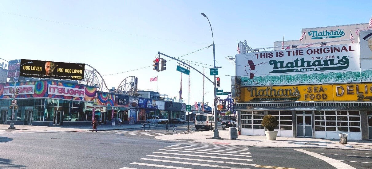 PETA’s billboard can be seen across from Nathan’s Famous at 1236 Surf Ave., in Brookyln. Similar billboards are running near meaty eateries in other animal-friendly cities throughout the country, including Chicago and Denver.