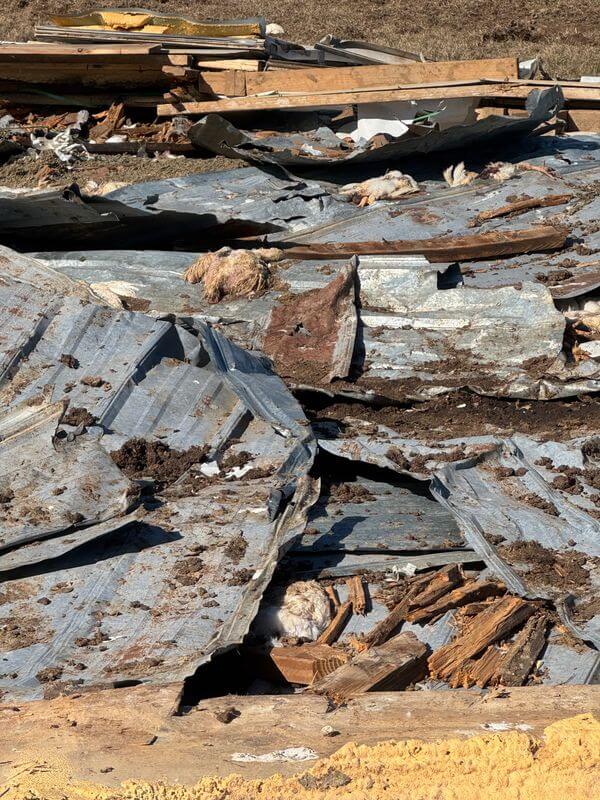 The farmer reportedly contacted Tyson after the roofs on the sheds collapsed in last week’s ice storm and reports that Tyson sent subcontractors to the farm who demolished the sheds—crushing many birds to death and leaving others to die under the debris—and stating that some chickens who managed to escape were run over by a bulldozer, while others were allegedly beaten to death.