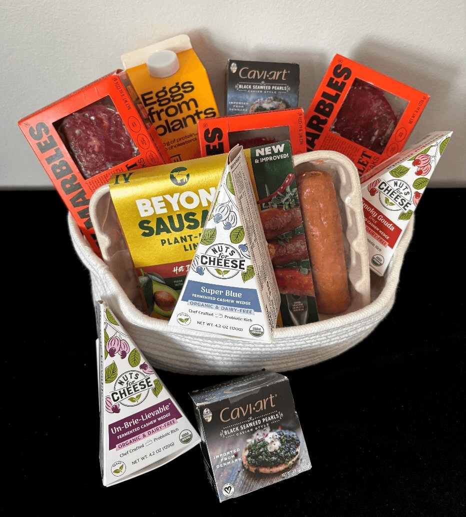 And like Cavi·art®, every product in the basket—including Juicy Marbles meaty filets and wedges of bleu, brie, and gouda from Nuts for Cheese—helps reduce the violence inflicted on animals and the planet.