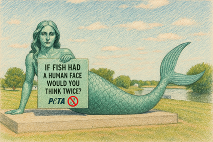 In time for Fish Amnesty Day (September 27), PETA today sent a letter to Baudette Mayor Dylan Hancharyk asking him to tip the scales toward compassion by adding a massive mermaid sculpture to Willie Walleye Park with the message, “If Fish Had a Human Face, Would You Think Twice?” The proposed art installation would offer a counter view to the city’s “Willie Walleye” statue—which celebrates cruel and deadly fishing—by recognizing that fish are intelligent, feeling beings who deserve respect.