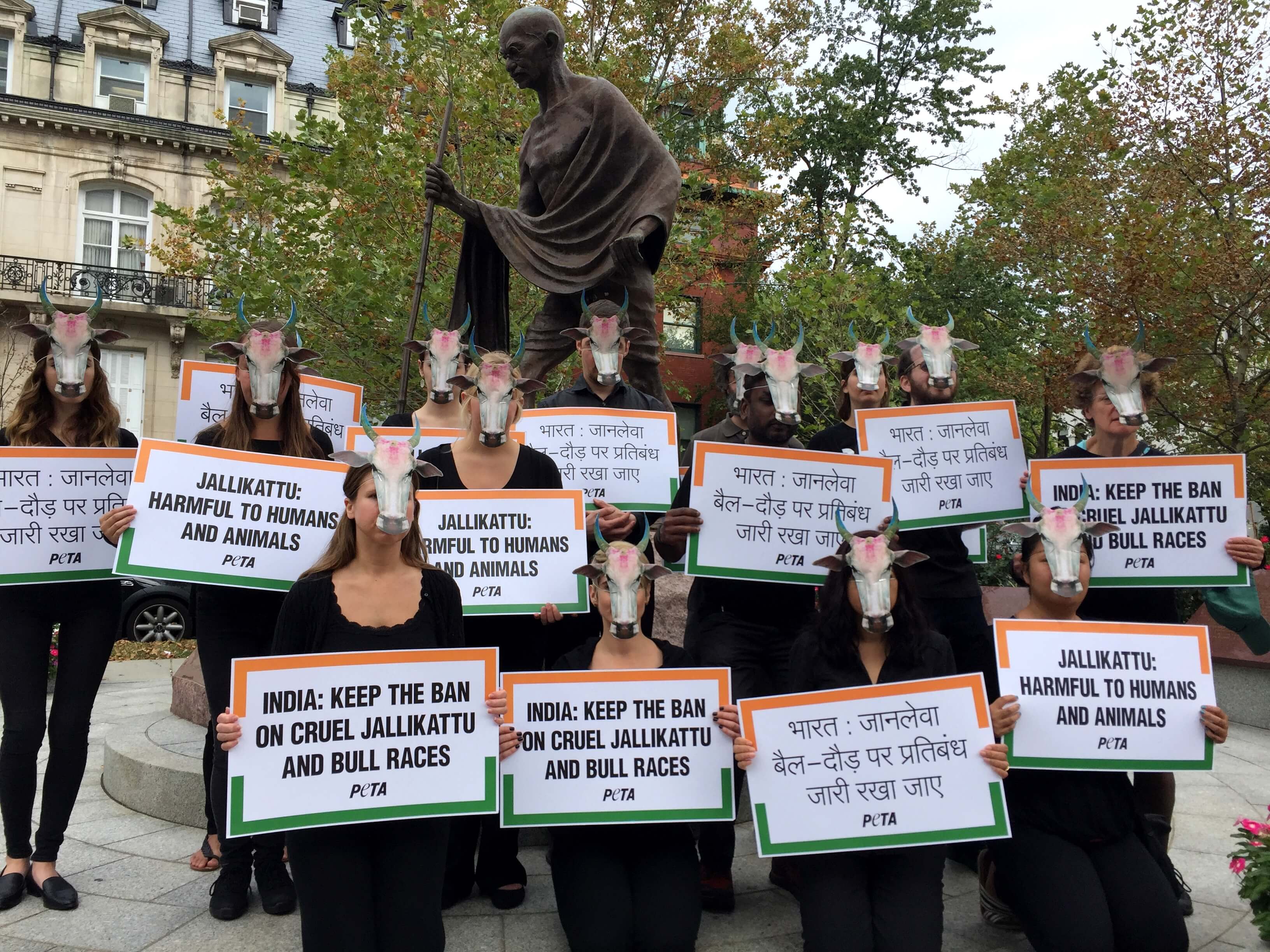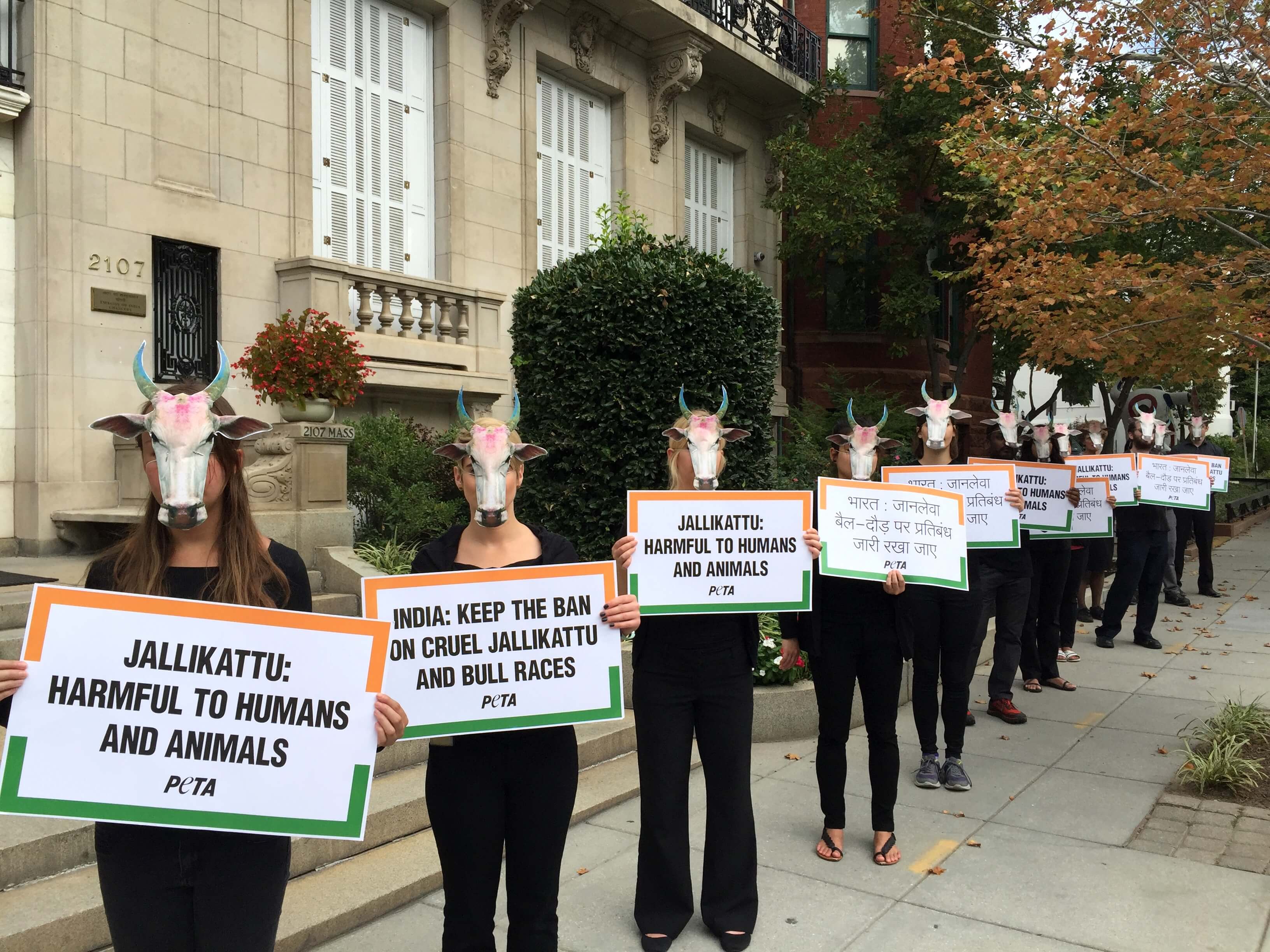 ‘Bulls’ Gather Outside Indian Embassy in Support of Ban on Cruel Bullfights and Races.