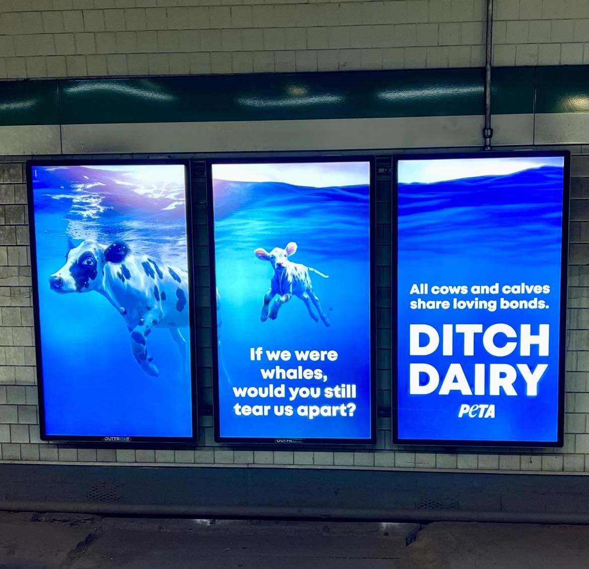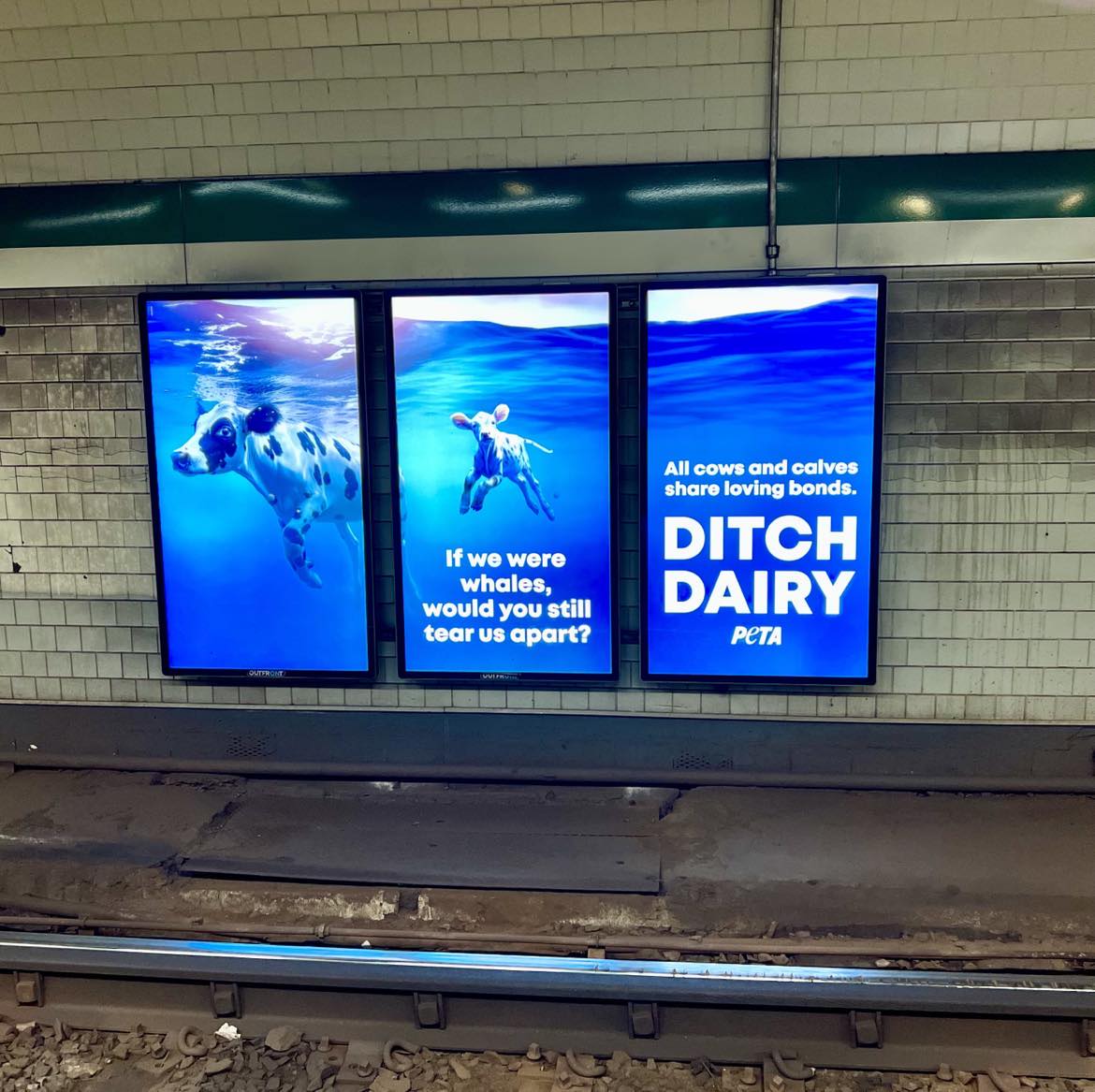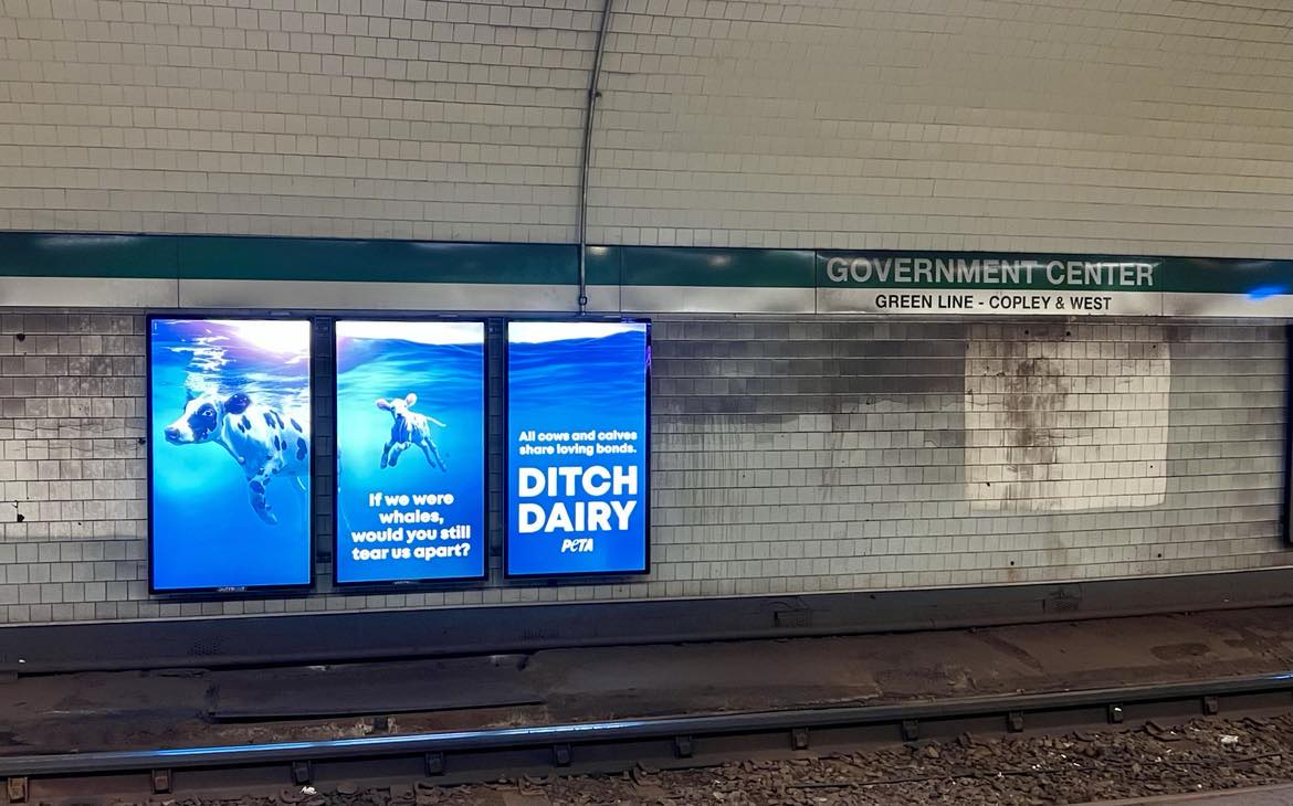Photo of ditch dairy ads in Boston subway. The ad has been formatted into three panels. The text is legible and reads if we were whales, would you still tear us apart? All cows and calves share loving bonds. Ditch dairy