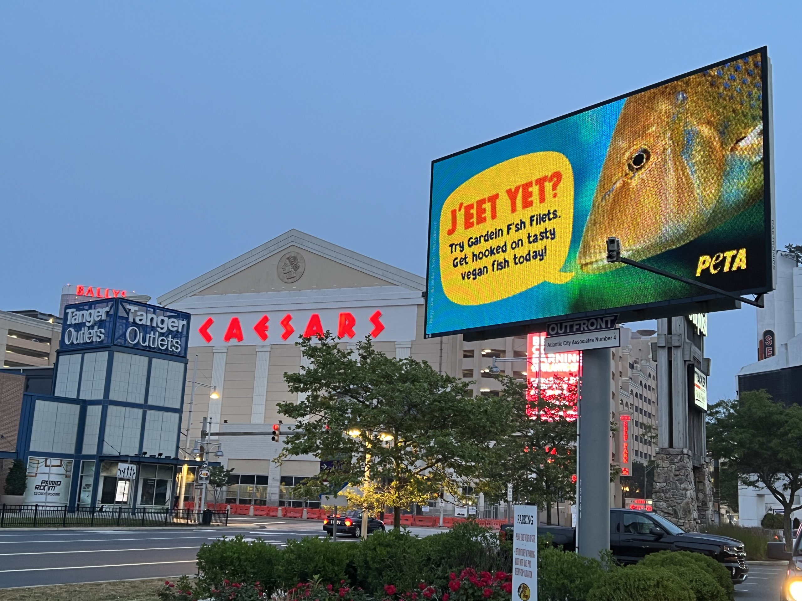 Photo of billboard with a fish. Speech bubble reads jeet yet? try gardein fish filets. Get hooked on tasty vegan fish today!