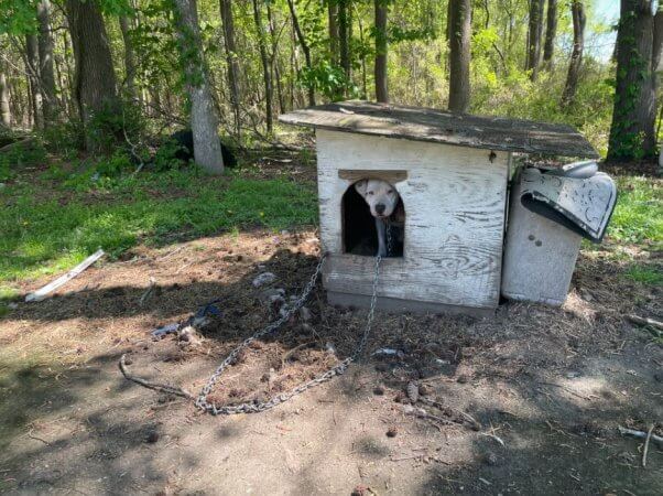Someone holds the dog's head, showing the wounds around his neck sustained from a chain