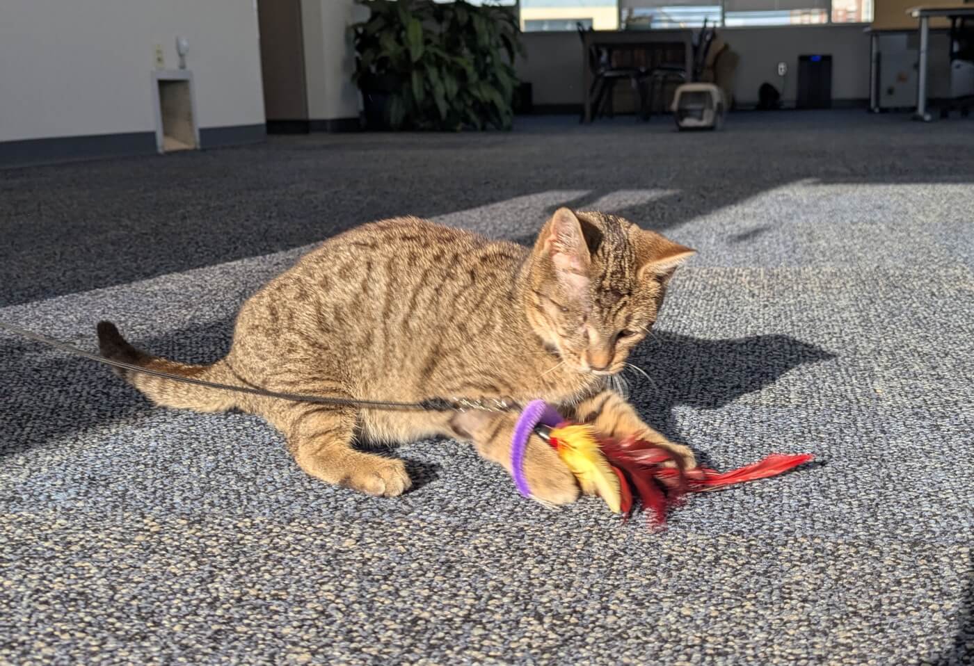 Now with one eye (and one “i”), Barti was quick to adapt to life as an indoor-only cat. His foster guardian reports that the now 6-month-old tween is kind of the perfect companion cat: He’s equally happy to curl up for meditation on his human’s lap or to attend a playful youth group with his feline foster friends. He’s had to return to PETA’s clinic for a veterinary recheck or two, and his foster guardian even reports that he’s quite keen on a car ride!