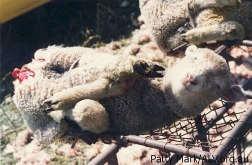 To prevent this “flystrike,” Australian ranchers force live sheep onto their backs, restrain their legs between metal bars, and carve huge chunks of skin away from the animals’ backsides or attach vise-like clamps to their flesh until it dies and sloughs off. Both procedures, called “mulesing,” are terribly painful and ineffective.