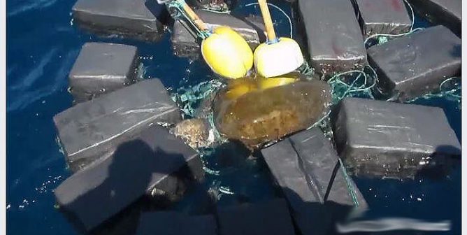 An entangled sea turtle was saved by the Coast Guard after being found caught in cords securing a bundle of cocaine that was floating in the ocean.