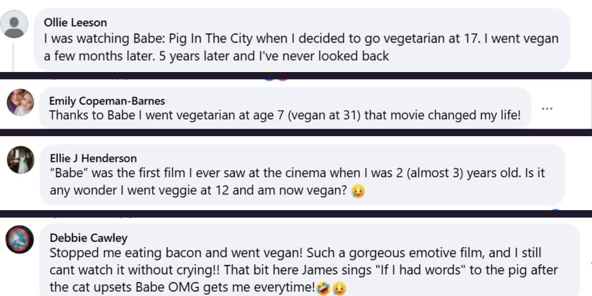 Cromwell isn’t the only one forever changed by Babe. Fans flooded social media with powerful stories about how the film sparked their compassion: thousands shared their stories of how Babe impacted them, many mentioning they went vegan after watching.