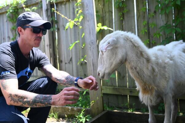 Chris lives with his partner Emily and adopted canine companion Lucy. Lucy used to be tethered outdoors around the clock until PETA’s rescue team saved her. Chris says Lucy is now “the queen of the house,” and spends her days comfortably indoors with plenty of long walks and camping trips to enjoy.