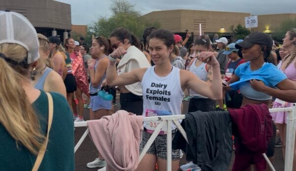Running a marathon is hard, but the life of a dairy cow is infinitely harder. Vegan athlete Starlynn Costa staged a 26.2-mile-long protest as she ran wearing a tank top reading “Dairy Exploits Females” on the front and “You Can’t Be a Milk-Drinking Feminist” on the back.