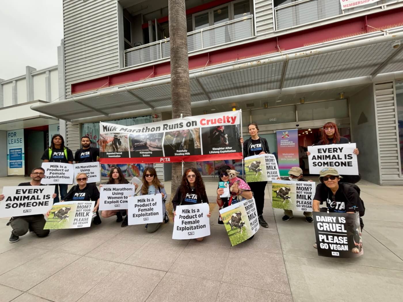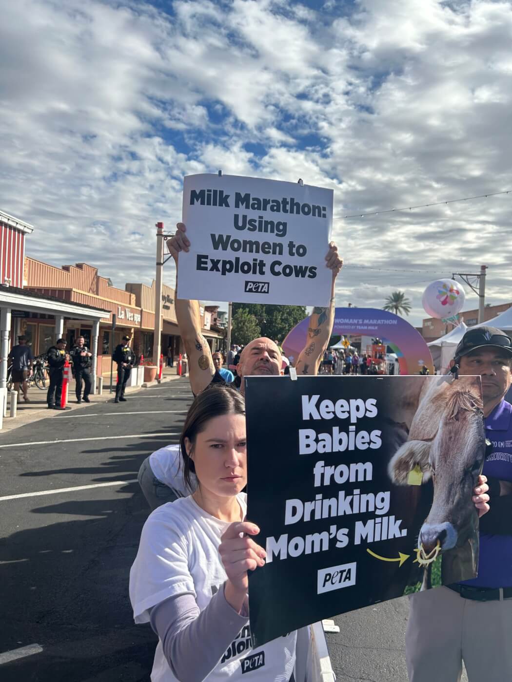 While Costa ran, PETA supporters hung banners, waved signs, and handed out hundreds of leaflets to participants and their friends and family, which detailed how female cows and their babies are exploited and abused for milk.