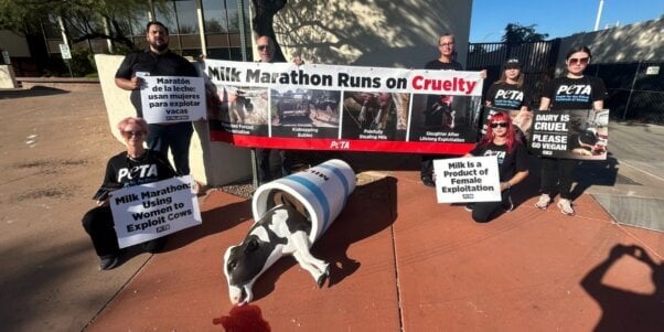 PETA is urging Kathrine Switzer to stand in solidarity with all females, cut ties with the cruel dairy industry, and dump this dairy-funded PR stunt. There’s no reason to stand with exploiters when you can run with compassion.