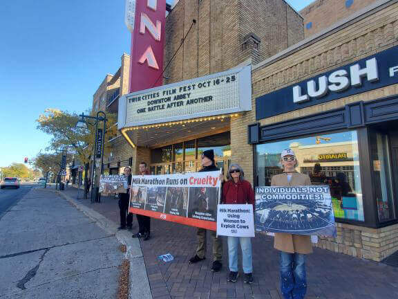When film fests in Washington D.C. and Minnesota showcased Team Milk’s mini documentary “Forward Is a Pace,” PETA protesters were waiting outside theaters to stop viewers in their tracks and tell them the truth about cow’s milk.